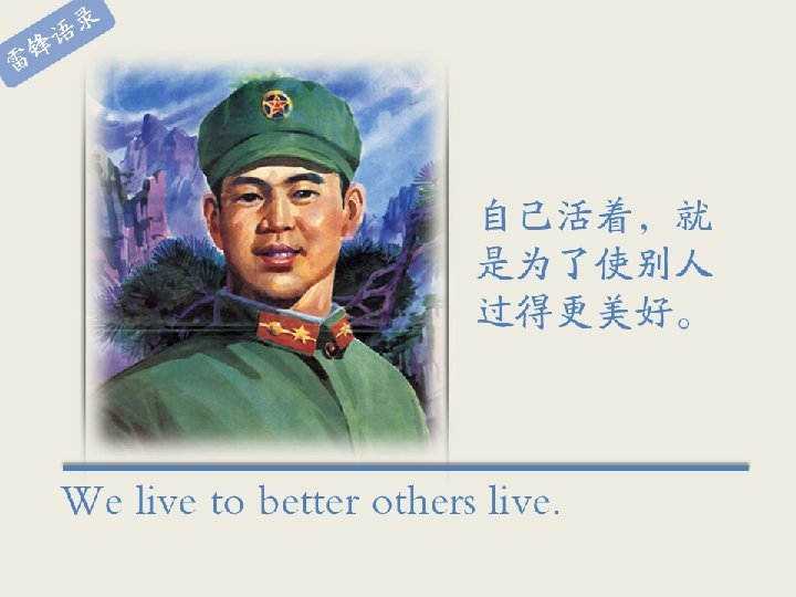 � � 雷 � 当祖国和人民 � 在最危急的 关� ,我就挺 身而出,不怕 � 牲。生� 人 民生,死� 人 民死。 When my motherland her people are at the critical moment, I won’t hesitate to step forward and sacrifice my life. I was born and will die for the