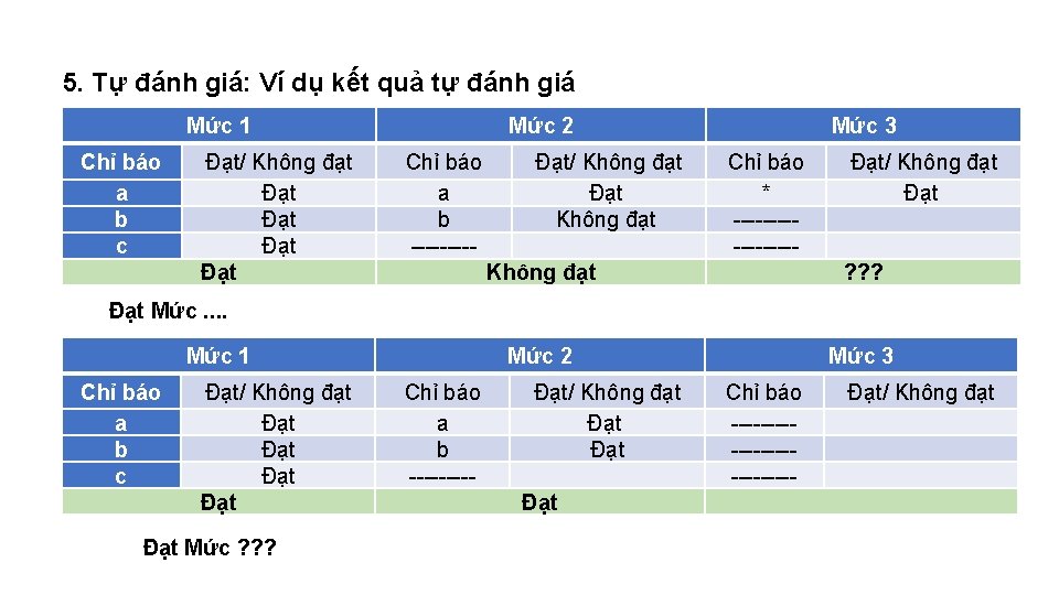 5. Tự đánh giá: Chỉ báo được công nhận đạt khi tất cả các nội hàm của chỉ báo đạt yêu cầu; tiêu chí đánh giá được công nhận đạt khi tất cả các chỉ báo trong tiêu chí đạt yêu cầu. Tiêu chí được đánh giá đạt Mức 1 khi tất cả các chỉ báo của Mức 1 đạt; đạt Mức 2 khi đạt Mức 1 và tất cả các chỉ báo của Mức 2 đạt; đạt Mức 3 khi đạt Mức 2 và tất cả các chỉ báo của Mức 3 đạt. Mức 1 Chỉ báo Đạt/ Không đạt a b c Đạt/ Không đạt Mức 2 Chỉ báo Đạt/ Không đạt a b ---- Đạt/ Không đạt Đạt Mức. . /(hoặc Không đạt) Mức 3 Chỉ báo Đạt/ Không đạt * -------- Đạt/ Không đạt