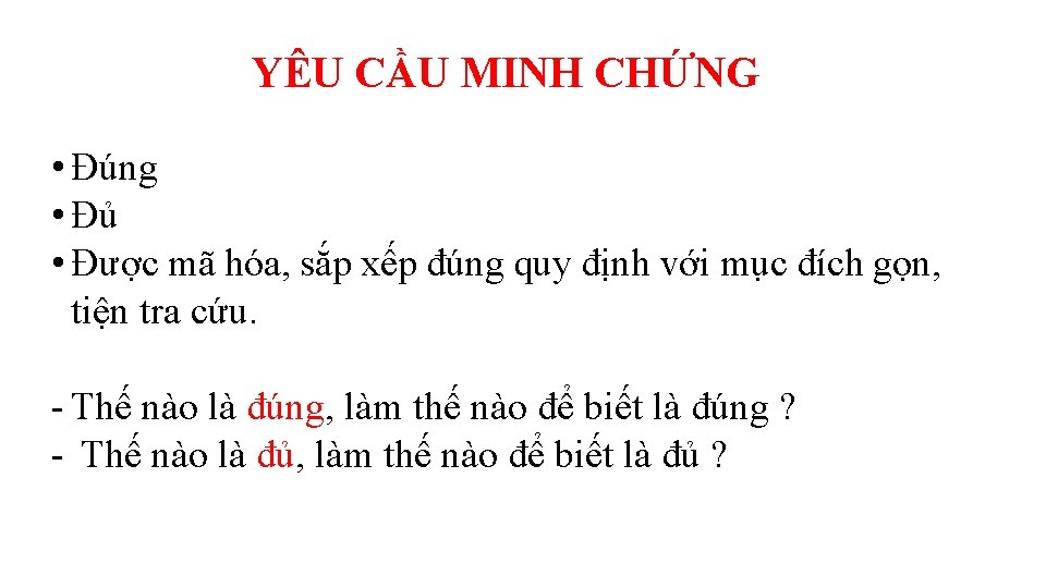 Đúng Đủ - MC đưa ra phù hợp yêu cầu tiêu chí; - MC có độ tin cậy: nếu người khác thu thập thì cũng được minh chứng như vậy; - Có đủ các MC cho 1 chu kỳ; - Các MC kể từ khi bắt đầu một hoạt động cho đến khi có kết quả của hoạt động đó; - Ngoài các MC là văn bản của trường, MC còn có thể là văn bản của CQ quản lý cấp trên;