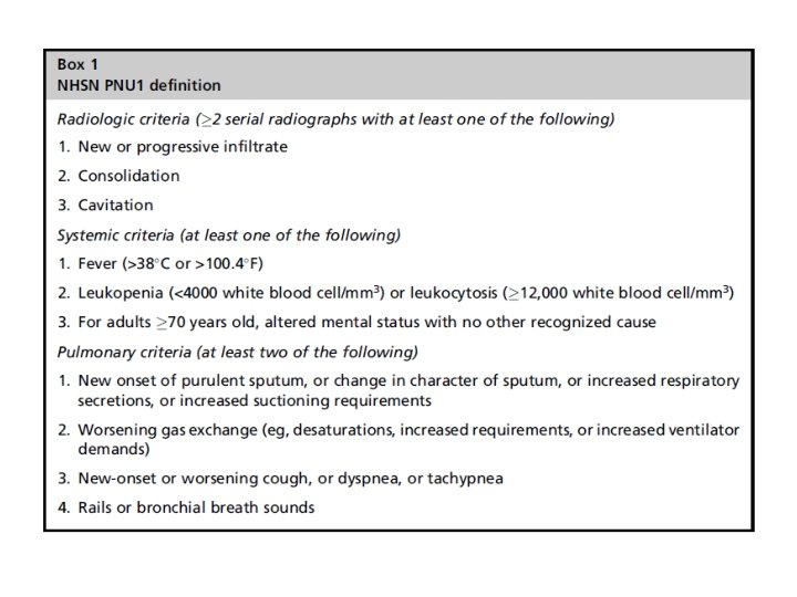 Definições – Como era? • As definições de pneumonia do NHSN foram atualizadas pela última vez em 2002, e foram feitas para vigilância de todos os casos de pneumonias, incluindo mas não limitados PAV. • Três componentes fazem parte das definições: “Radiológico” (obrigatório); “Sinais e Sintomas” (obrigatório) e “Laboratório” (opcional). • PAV era definida especificamente como uma pneumonia que ocorre enquanto o paciente está em uso de ventilador, ou até 48 horas após sua interrupção. Não havia nenhuma duração mínima de uso do ventilador para qualificar uma pneumonia como PAV.