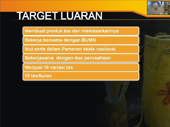 Februari Mulai pembuatan produksi Tas Maret Mulai pemasaran dan promosi tas melalui Internet (facebook dan blog ) Mengikuti Stand di Kampus APRIL Fokus pada Pemasaran