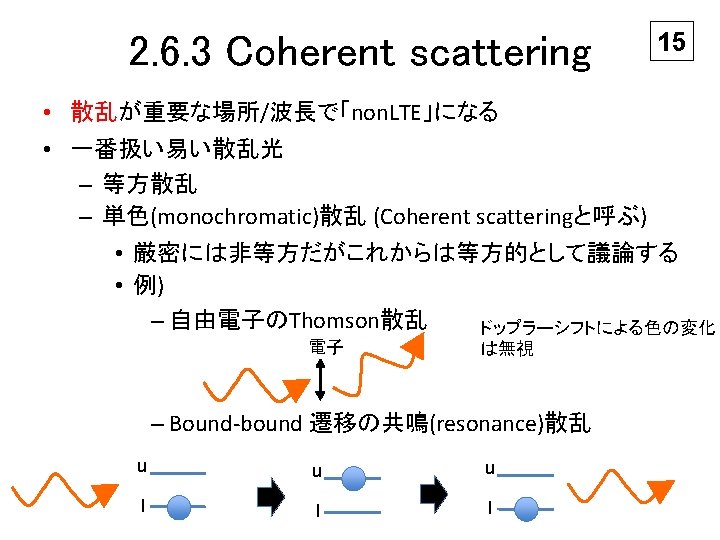 2. 6. 3 Coherent scattering 17 Coherently scattering medium 単色、bound-boundの吸収係数は、 = photon destruction + photon scattering ちなみに、 連続光の吸収係数= 「(bound or free)-free」 + 「Thomson or Rayleigh scattering」 自由電子や粒子による光の散乱