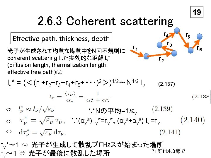2. 6. 3 Coherent scattering Two-level atoms 16 波長は限定し空間的な非局所性だけ考える permits detailed discussion of spatial non-locality due to photon scattering process without spectral non-locality due to photon conversion processes. Bound-bound process Photon creation Photon scattering Photon destruction 右水平方向が 観測者 詳細は 3. 4. 1で