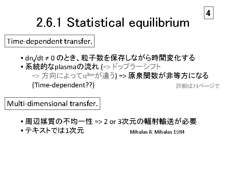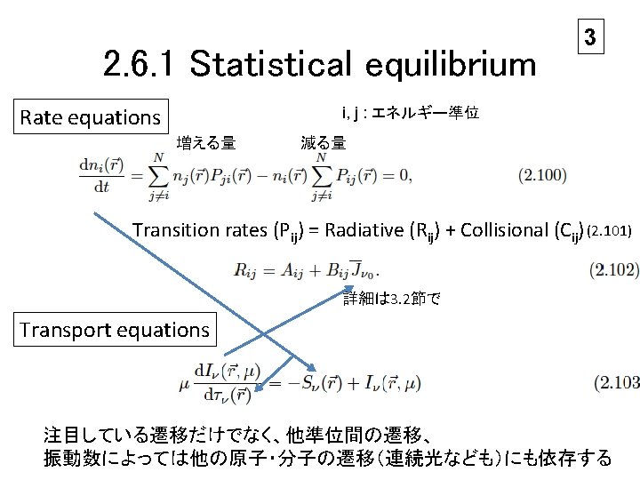 2 non-LTE • Non-local thermodynamical equilibrium • ここでは、 ψ: 自然放射の emission 確立分布 Χ : 誘導放射の profile shape φ : extinction profile – Statistical equilibrium ○ – Maxwell distribution ○ – Complete redistribution (Χν=ψν=φν) ○ – Population ≠ local Saha-Boltzmann equilibrium
