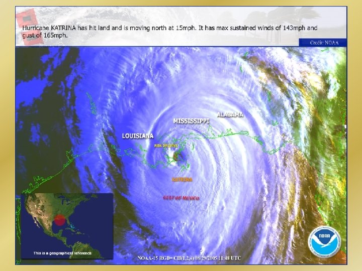 Hurricanes Katrina and Rita Aftermath The effect of Hurricane Katrina on New Orleans was extremely severe, resulting from one of the deadliest natural disasters in U. S. history. By August 30, 2005, one day after the Category 4 storm made landfall, 80 percent of the city of New Orleans was flooded, with some parts of the city under 20 feet (6 m) of water. The flood was caused by several levee breaches due to a combination of a powerful storm surge, strong winds and excess water in the bodies of water surrounding the city. The event continues to have major implications for a large segment of the population as well as for the economy of and politics in the entire United States. Areas affected include southern Florida, Louisiana (especially the Greater New Orleans area), Mississippi, Alabama, the western Florida Panhandle, western and north Georgia (hit by tornadoes), the Tennessee Valley and Ohio Valley regions, the eastern Great Lakes region and the length of the western Appalachians. Over 1, 100 deaths have been reported in seven states, a number which is expected to rise as casualty reports come in from areas currently inaccessible. Three levees in New Orleans gave way, and 80% of the city was under water at peak flooding, which in some places was 20 to 25 feet (7 or 8 meters) deep[40]. As of September 6, the flood pool had abated to covering 60% of the city. The effects of Hurricane Rita, were not nearly as severe as expected. The storm surge feared in Galveston did not materialize, as the city was well to the west of the storm's center; the strong winds actually flattened the surge, which was only seven feet (2 m), and the seawall was easily able to handle it. The 5 inches (130 mm) of rain expected to fall overnight in New Orleans also did not happen, and the pressure on the levee system was eased. However, local storm surges of 15 to 20 feet (4. 5 -6. 1 m) in southwestern Louisiana were reported, and in from coastal parishes, damage was extensive. Cameron Parish was heavily damaged, with the communities of Holly Beach, Hackberry and Cameron being essentially destroyed. Calcasieu Parish, with the communities of Lake Charles, Sulphur, Westlake and Vinton also suffered heavy damage. In total, it is estimated that well over 2 million customers are without electricity. Currently, the total insured damage is estimated at $4 -6 billion, which means the overall damage in coastal areas will likely be between $8 -11 billion. Inland flooding could increase those numbers substantially.