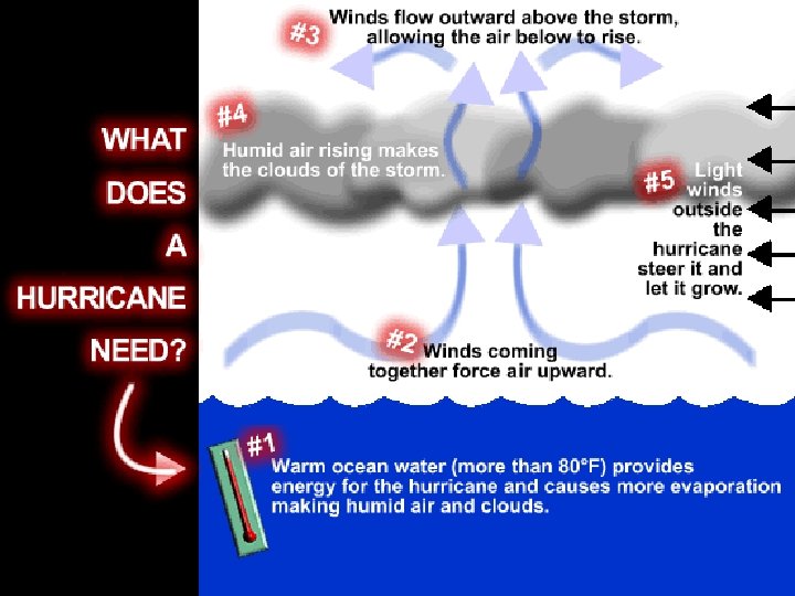 • Formed from simple complexes of thunder storms • Conditions for a hurricane formation: • Water must be warmer than 26. 5 degrees • High relative humidity in the lower and middle troposphere are required • Vertical wind shear in a tropical cyclone’s environment is also important