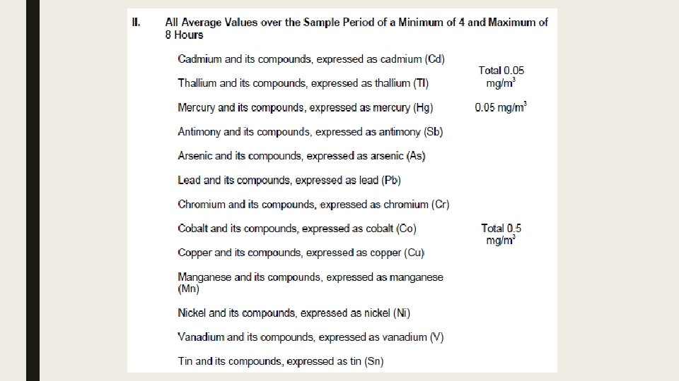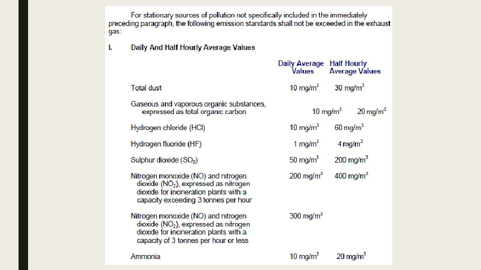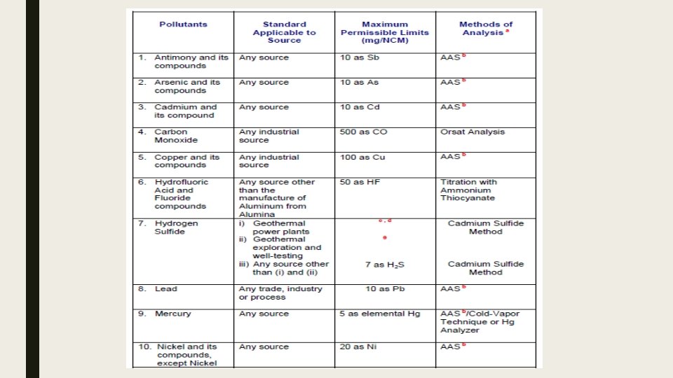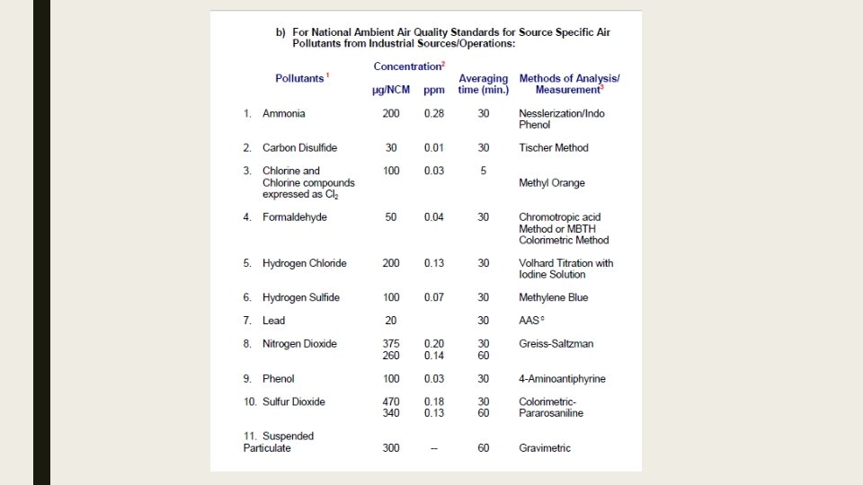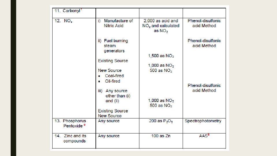 Maximum limits of sulfur oxides Existing Sources i. Manufacture of Sulfuric Acid and Sulf(on)ation Process (2. 0 gm/NCM) as SO 3 ii. (ii) Fuel Burning Equipment (1. 5 gm/NCM) as SO 2 iii. (iii) Other Stationary Sources a (1. 0 gm/NCM) as SO 3 New Sources i. Manufacture of Sulfuric Acid and Sulf(on)ation Process (1. 5 gm/NCM) as SO 3 ii. Fuel Burning Equipment (0. 7 gm/NCM) as SO 2 iii. Other Stationary Sources a (0. 2 gm/NCM) as SO 3