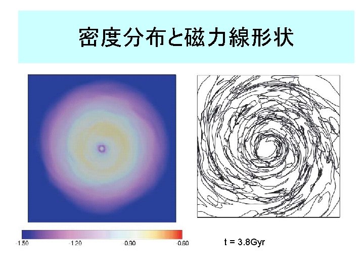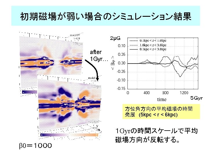 Formation of magnetic loops Magnetic loop structure : plasma β=1 Hight : 400 pc Length : 1 kpc Inclination angle: 40度 Magnetic loops are created where the gas density becomes lower than the region outside the loop. Yellow: Isosurface of β=1 Blue: Magnetic field strength