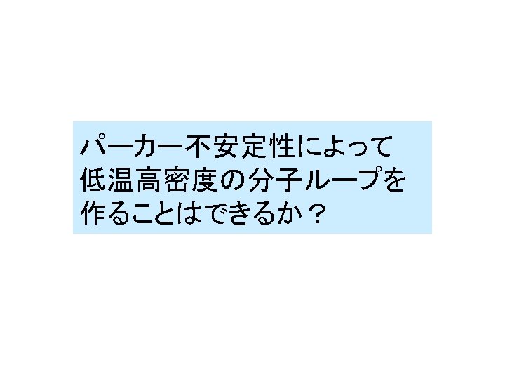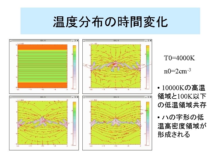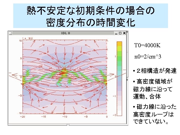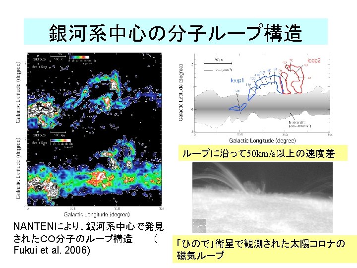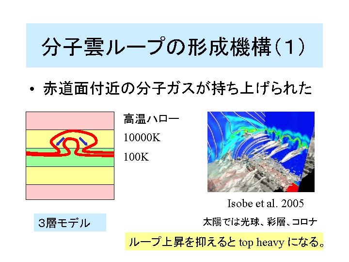 velosity Loop形成のメカニズム velosity position Color: 12 CO Contour: 13 CO(white) position B=100μG 体積=100pc3 個数密度 n= 15 0 cm-3 Emag = 1052 erg アルフベン速度 VA = 24 km s-1