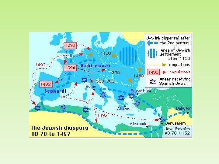 La diáspora judía después del año 70 d. C. Ø Año 70: destrucción del segundo templo y de la ciudad de Jerusalén por Gral. Tito, hijo del Vespasiano, futuro emperador. Profecía de la dispersión Deut. 28: 1 / 63 -66 Mateo 24: 1 -2 Ø