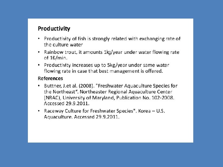 How many fish? • For trout, stocking rates of 30 to 50 kg/m 3 are normal at the end of a rearing cycle! • While for marine species, such as sea-bass and sea-bream, the achievable load is lower, between 15 and 20 kg/m 3. • Raceway volume required = total amount of fish in kg/stocking rate in kg per m 3.