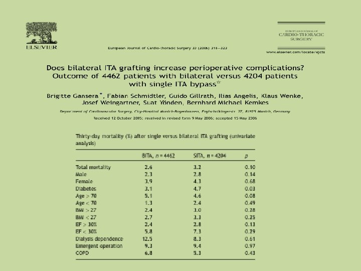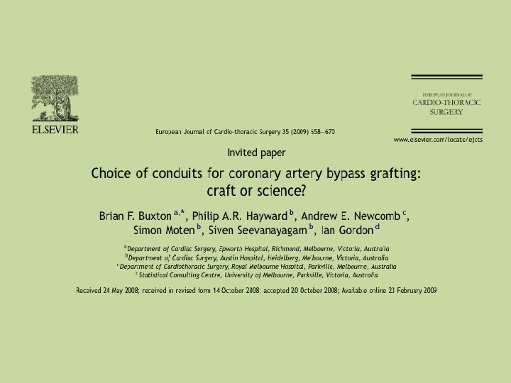 The effect of total arterial grafting on medium-term outcomes following coronary artery bypass grafting Jean-Francois Légaré , Ansar Hassan , Karen J Buth and John A Sullivan Queen Elizabeth II Health Sciences Center, Halifax, Nova Scotia, Canada Journal of Cardiothoracic Surgery 2007, 2: 44 doi: 10. 1186/1749 -8090