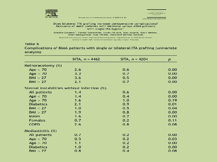 Randomized trial to compare bilateral vs. single internal mammary coronary artery bypass grafting: 1 -year results of the Arterial Revascularisation Trial (ART). Taggart DP, Altman DG, Gray AM, Lees B, Nugara F, Yu LM, Campbell H, Flather M; on behalf of the ART Investigators. Eur Heart J. 2010 Aug 30. • Coronary artery bypass graft patients were enrolled in 28 hospitals in seven countries. • Three thousand one hundred and two patients were randomly assigned to SIMA (n = 1554) or BIMA (n = 1548). The mean number of grafts was 3 for both groups. • Forty per cent of the SIMA procedures and 42% of the BIMA were performed off-pump. • Mortality at 30 days was 18 of 1548 (1. 2%) for SIMA and 19 of 1537 (1. 2%) for BIMA, and at 1 year was 36 of 1540 (2. 3%) and 38 of 1529 (2. 5%), respectively. • The rates of stroke, myocardial infarction, and repeat revascularization were all </=2% at 1 year and similar between the two groups. • Sternal wound reconstruction was required in 0. 6 and 1. 9% of the SIMA and BIMA groups, respectively.