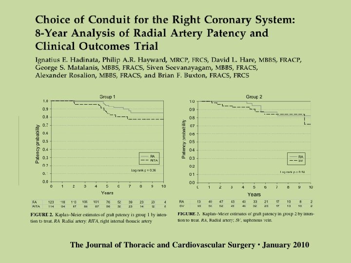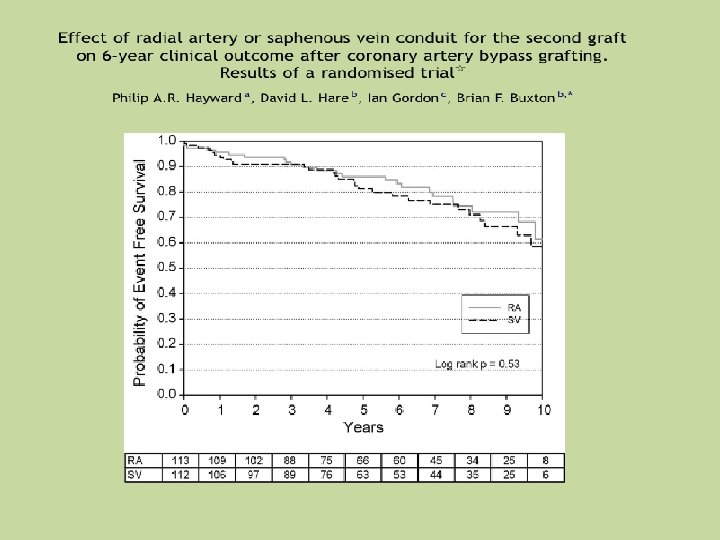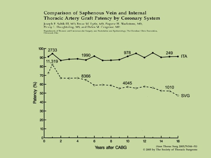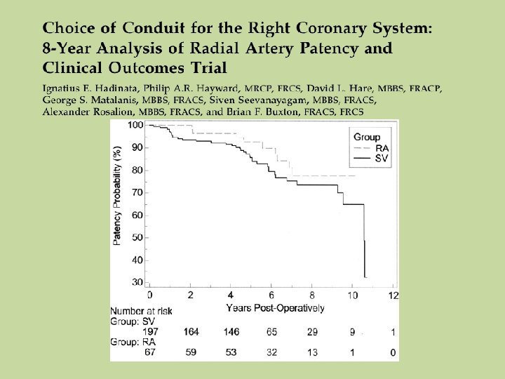 Conclusion • • LIMA = RIMA to LAD (. 5 years)* LIMA > SVG (10 - 15 years) RA > SVG (8 years)* RA = FRIMA (<70) = SVG (>70) (6 years)* RA > SVG in small vessels and probably females* SVG > RA in target vessel stenosis < 80% & PVD* SVG > GEA to RCA (except in vessels < 1 mm)* Patient factors have a big role to play.