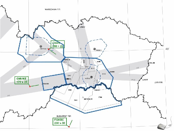Úloha cvičenia č. 3: Naviesť dané lietadlá na ILS priblíženie dráhy O 1 s využitím predpisovej frazeológie. Zahlásiť aktuálnu meteo situáciu každému lietadlu pred preklesaním prevodnej hladiny a zahlásiť polohu každému lietadlu pred zahájením konečného priblíženia. Dodržiavať rozstupy medzi lietadlami a dodržiavať minimálne sektorové výšky. Zadanie cvičenia č. 3: Počasie: 190/3 8 km OVC/3500 1001 10/3 Čas 01´ 01´ Volací znak CIA 41 ↓ FGKBC ↓ OMVKE ↓ Radiál R 300 H 050 H 078 Vzdialenosť Hladina 41 NM F 090 48 NM F 230 F 110 56 NM F 170 F 100 Rýchlosť S 220 kts S 300 kts S 250 kts Typ L 410 FA 20 BE 9 L