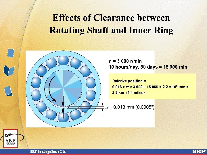 Conditions of Rotation A Bearing Ring subjected to a rotating load will turn On its own seating if mounted with a clearance fit, and wear of the contacting surfaces will occur. The degree of interference needed is dictated by the Operating conditions i. e. , 1. Magnitude of the Load 2. Temperature Conditions