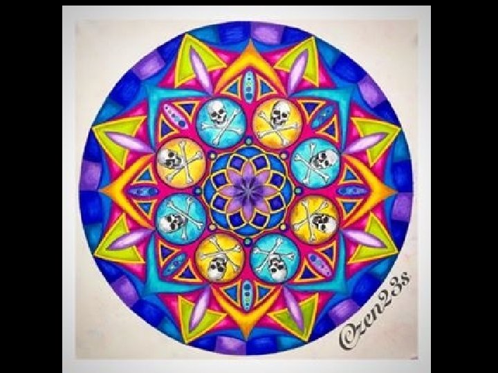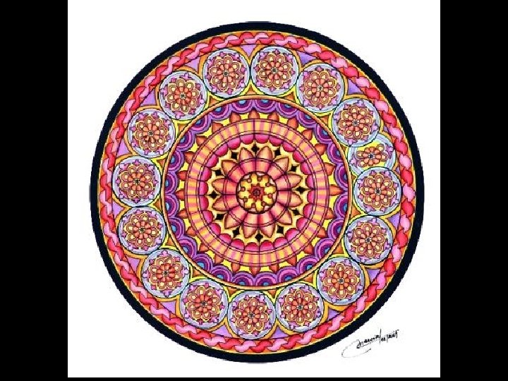 Mandala: Step by Step • Draw 1 inch border around paper. • Find center point of each edge. • Draw straight lines to find center point of the Mandala. • Use compass to draw circle. Multiple circles. • Start in the center and work out toward the edges. • Experiment with patterns and shapes. • Personalize it! Make it meaningful to you.