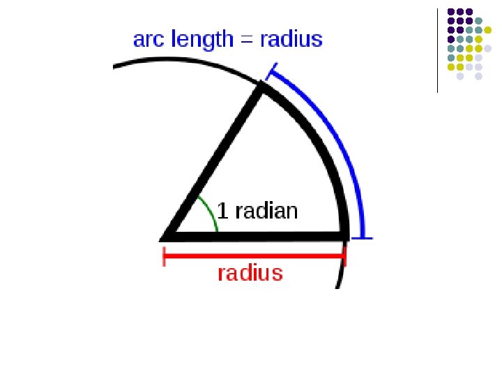 Radian Measure l l l Another way of measuring angles Convenient because major measurements of a circle (circumference, area, etc. ) are involve pi Radians result in easier numbers to use