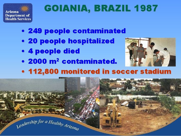 GOIANIA, BRAZIL 1987 • • • 249 people contaminated 20 people hospitalized 4 people died 2000 m 2 contaminated. 112, 800 monitored in soccer stadium