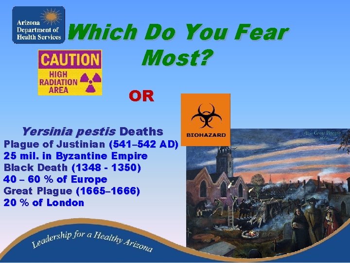 Which Do You Fear Most? OR Yersinia pestis Deaths Plague of Justinian (541– 542 AD) 25 mil. in Byzantine Empire Black Death (1348 - 1350) 40 – 60 % of Europe Great Plague (1665– 1666) 20 % of London