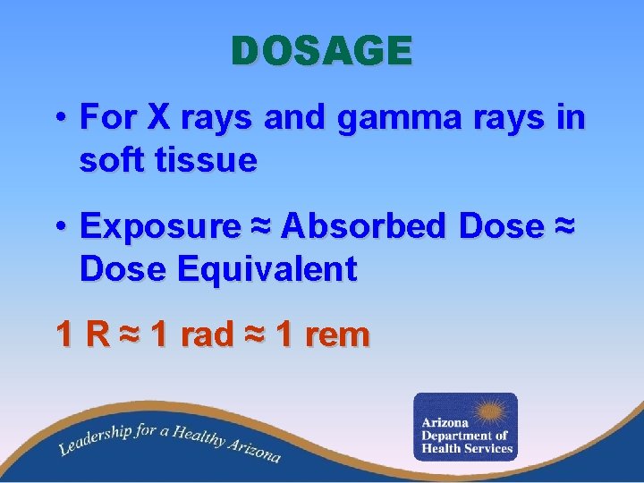 DOSAGE • For X rays and gamma rays in soft tissue • Exposure ≈ Absorbed Dose ≈ Dose Equivalent 1 R ≈ 1 rad ≈ 1 rem