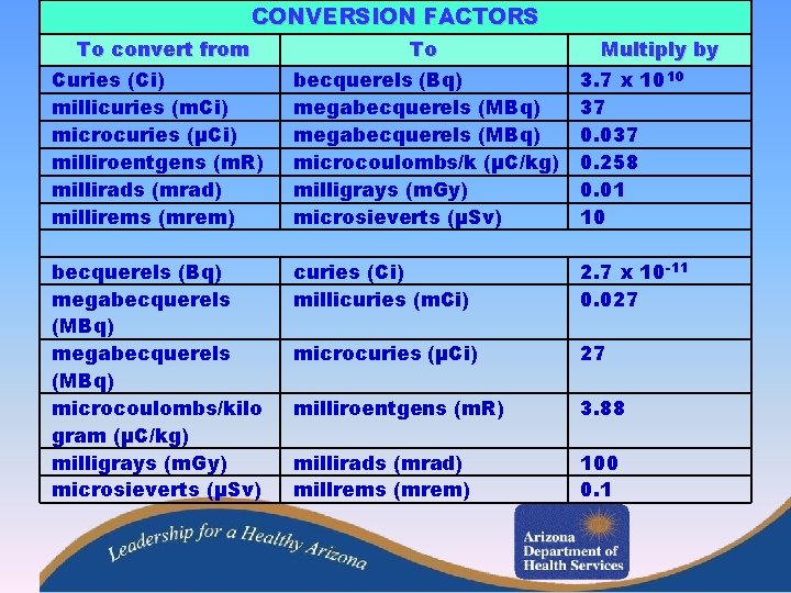 CONVERSION FACTORS To convert from To Multiply by Curies (Ci) millicuries (m. Ci) microcuries (µCi) milliroentgens (m. R) millirads (mrad) millirems (mrem) becquerels (Bq) megabecquerels (MBq) microcoulombs/k (µC/kg) milligrays (m. Gy) microsieverts (µSv) 3. 7 x 1010 37 0. 037 0. 258 0. 01 10 becquerels (Bq) megabecquerels (MBq) microcoulombs/kilo gram (µC/kg) milligrays (m. Gy) microsieverts (µSv) curies (Ci) millicuries (m. Ci) 2. 7 x 10 -11 0. 027 microcuries (µCi) 27 milliroentgens (m. R) 3. 88 millirads (mrad) millrems (mrem) 100 0. 1