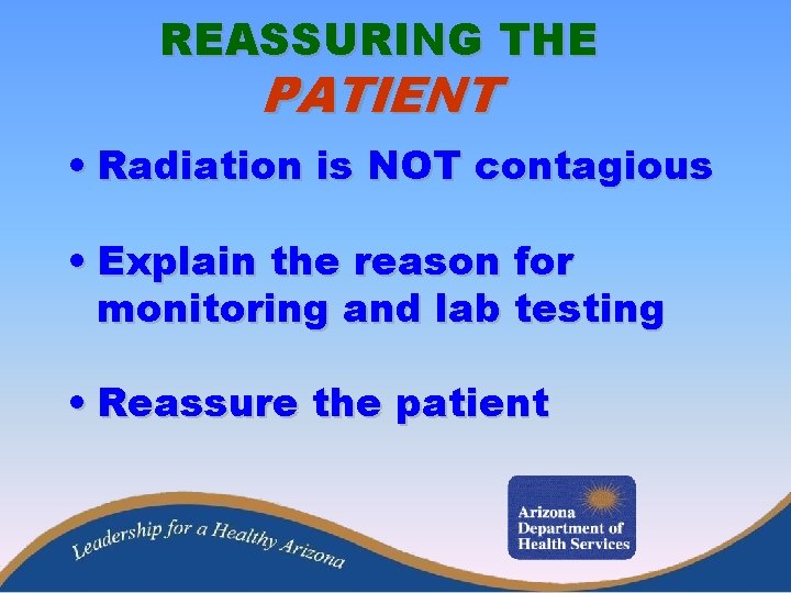 REASSURING THE PATIENT • Radiation is NOT contagious • Explain the reason for monitoring and lab testing • Reassure the patient