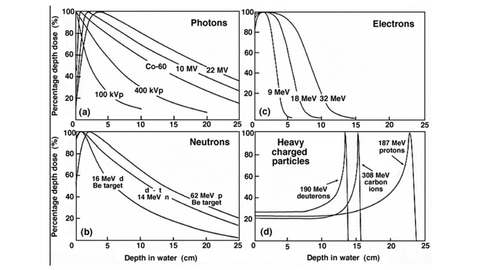 Absorbed dose distributions • Neutron fields • Produced by nuclear reactions • Photons/electrons > 8 -10 Me. V – max. yield from “giant” resonance ~20 Me. V • Release protons and heavier nuclei • Secondary charged particles deposit dose • 14 Me. V neutron beam similar depth-dose to 60 Co beam • Proton beams • Coulomb interactions with orbital electrons • Nuclear reactions • Bragg peak – distinct range