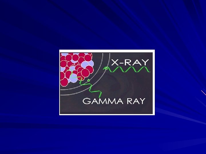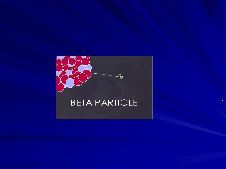 Beta Particles: High speed electron ejected from nucleus; -1 charge, light 0. 00055 AMU; Typical Energy = several Ke. V to 5 Me. V; Range approx. 12'/Me. V in air, a few mm in tissue; Low LET (QF=1) causing light damage (6 -8 ion pairs/µm in tissue). Primarily an internal hazard, but high beta can be an external hazard to skin. In addition, the high speed electrons may lose energy in the form of X-rays when they quickly decelerate upon striking a heavy material. This is called Bremsstralung (or Breaking) Radiation. Aluminum and other light (<14) materials are used for shielding.