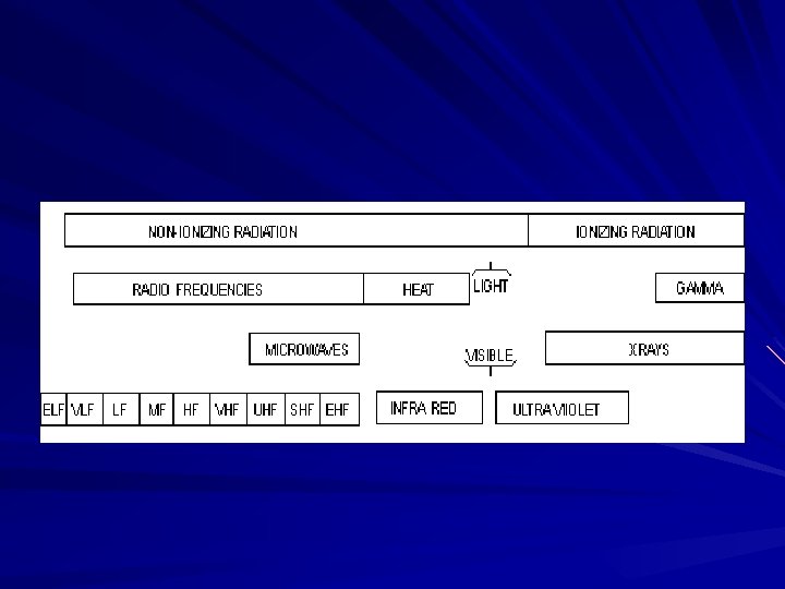 Examples on Non-ionizing Radiation Sources Visible light Microwaves ULTRA V Radios INFRARED Video Display Terminals TV AM Power lines RF Radiofrequency Diathermy (Physical Therapy) Lasers GAMMA VISIBLE MICROWAVE