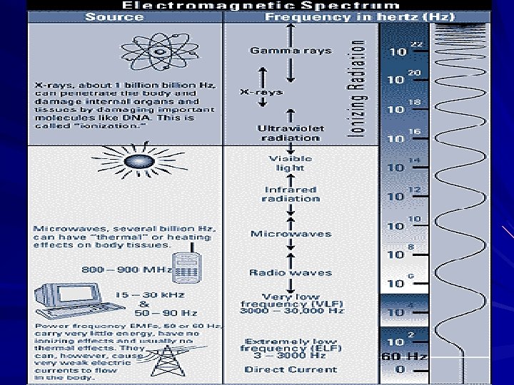Effects l Radiofrequency Ranges (10 k. Hz to 300 GHz) – – Effects only possible at ten times the permissible exposure limit Heating of the body (thermal effect) Cataracts Some studies show effects of teratoginicity and carcinogenicity.