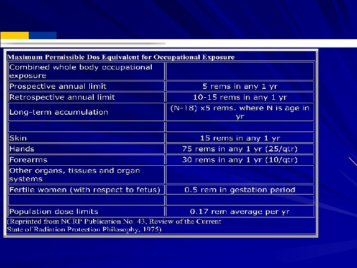 Exposure Limits OSHA Limits: Whole body limit = 1. 25 rem/qtr or 5 rem (50 m. Sv) per year. Hands and feet limit = 18. 75 rem/qtr. Skin of whole body limit = 7. 5 rem/qtr. Total life accumulation = 5 x (N-18) rem where N = age. Can have 3 rem/qtr if total life accumulation not exceeded. Note: New recommendations reduce the 5 rem to 2 rem.