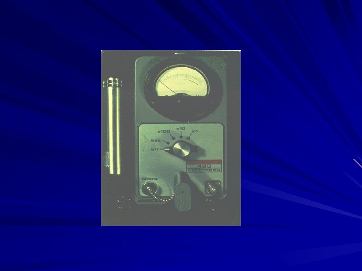 Direct Reading Survey Meters and Counters: Useful in identifying source of exposures recorded by personal dosimeters, and in evaluating potential sources, such as surface or sample contamination, source leakage, inadequate decontamination procedures, background radiation. Common types: Alpha Proportional or Scintillation counters Beta, gamma Geiger-Mueller or Proportional counters X-ray, Gamma Ionization chambers Neutrons Proportional counters
