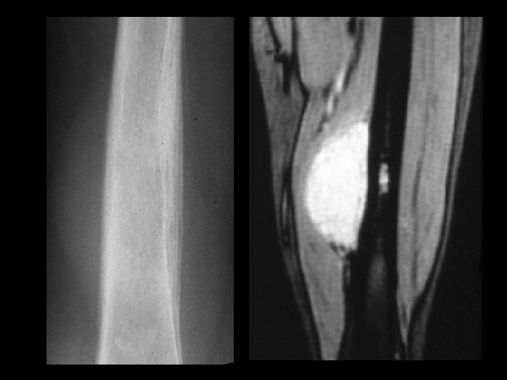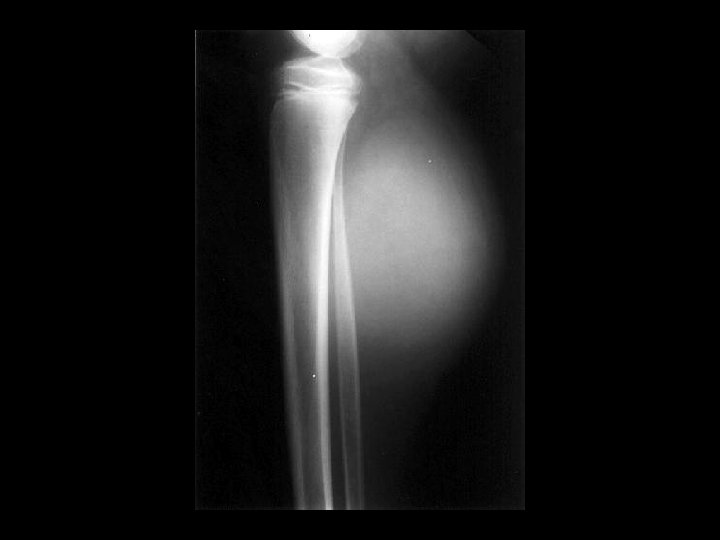 Synovial Sarcoma • • Findings: – Dense soft tissue mass – no bony involvement – heterogeneous T 1 Rare soft tissue tumor of children May show calcification Internal hemorrhage and necrosis are common Found close to joints Prone to metastases ddx: (plain film only) – hematoma