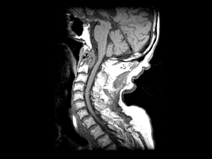 Rheumatoid arthritis • Findings: – Destruction of the dens and the anterior C 1 arch by a soft tissue mass – Impression of the anterior thecal sac with slight deformation of the cervical cord • ddx: – Infection – Metastasis