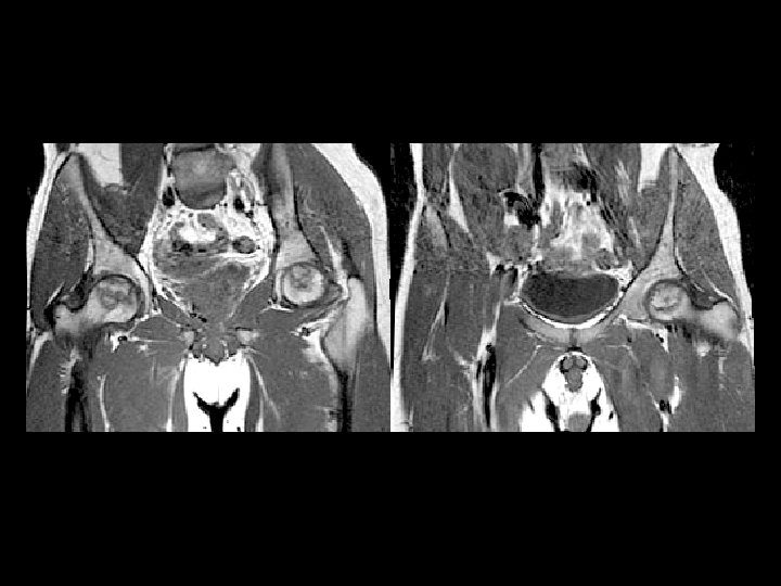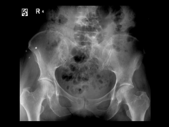 Prostate metastases • Findings: – Diffuse sclerosis • ddx: – Breat, GI mets – myelofibrosis – renal osteodystrophy – osteopetrosis – multiple myeloma