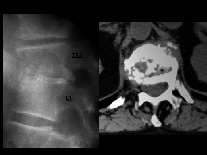 Discitis • Findings: – T 12 -L 1 disc space narrowing with endplate destruction – CT demonstrates presence of gas • ddx: – NONE! – This is an Aunt Minnie!