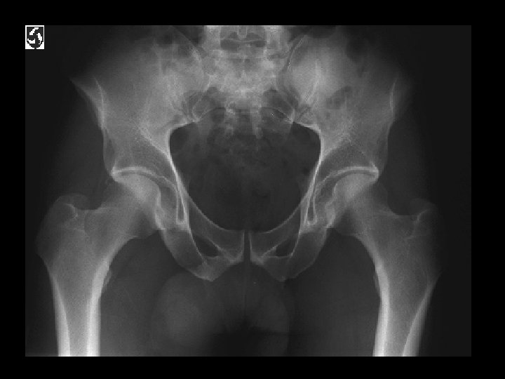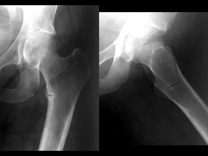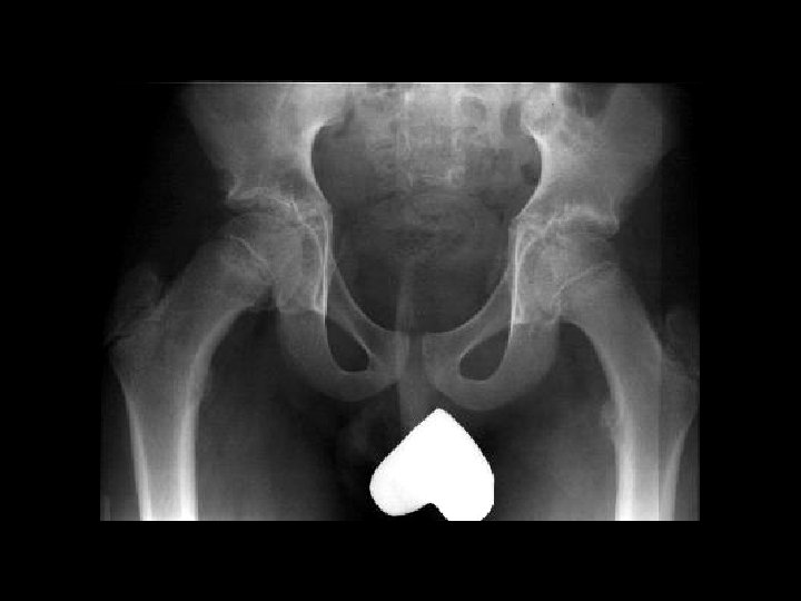 Bilateral SCFE • • Findings: – posteromedial displacement of femoral epiphyses Most common cause of limp in adolescents SH-I shearing fx high incidence in black, overweight pubertal males 75% uni, 25% bi Look for line along lateral femoral neck to transect 1/6 th of epiphysis Must be pinned or fixed