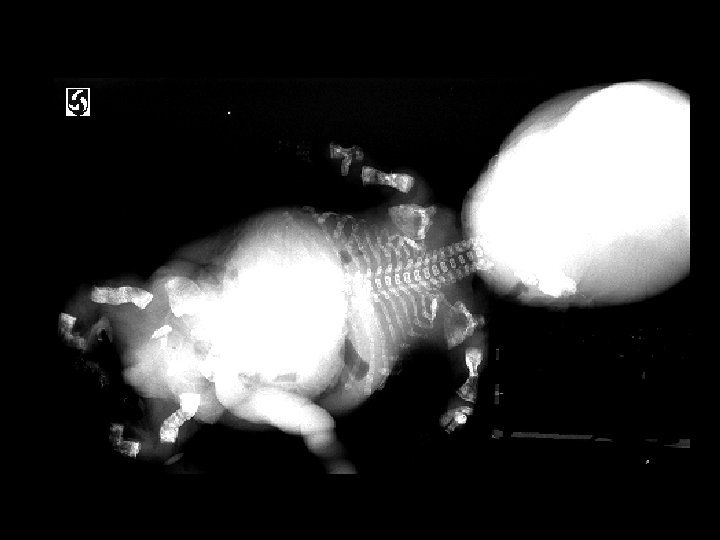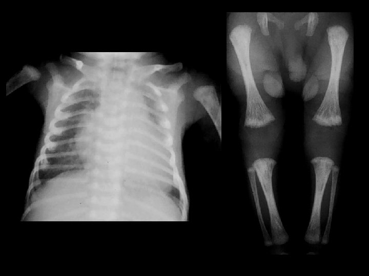 Osteogenesis Imperfecta Type II • Findings: – multiple fractures, bowing and short ribbon-like bones • Type II - lethal - “ribbon bones” and fractures too numerous to count • Disturbances in type I collagen – lack of normal collagen – osteoperosis – fractures – blue sclera • ddx: – NONE! – This is an Aunt Minnie!
