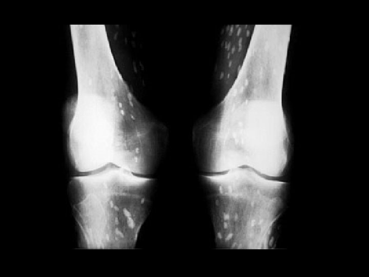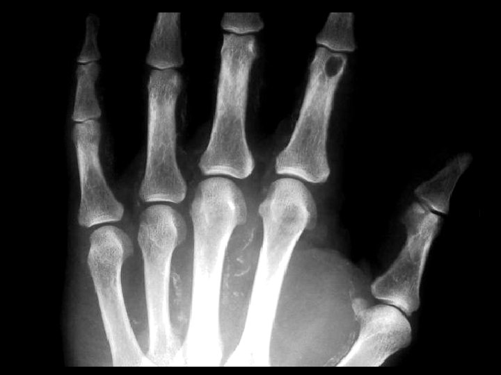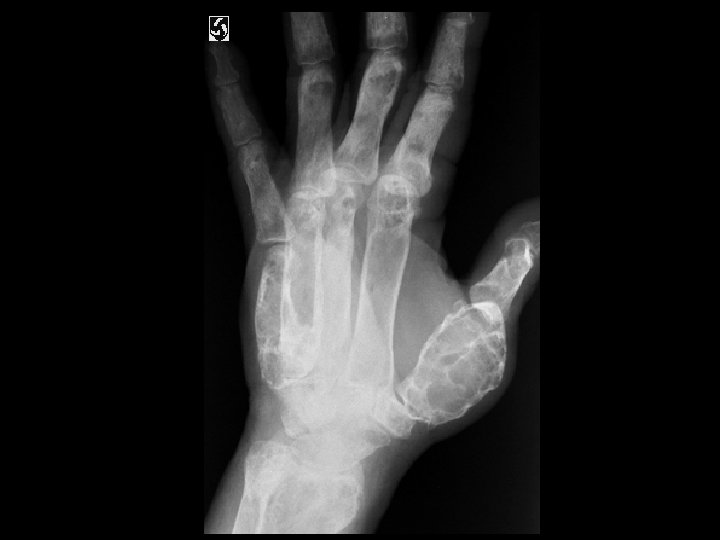 Tumoral Calcinosis • Findings: – Multiple dense calcifications around the joints of the fingers and wrists • ddx: (soft tissue Ca 2+) – Renal osteodystrophy – Heterotopic ossification – Metastatic Ca 2+ – Milk-alkali syndrome – Hypervitaminosis D – Scleroderma – Dermatomyositis