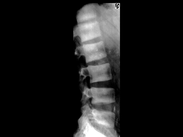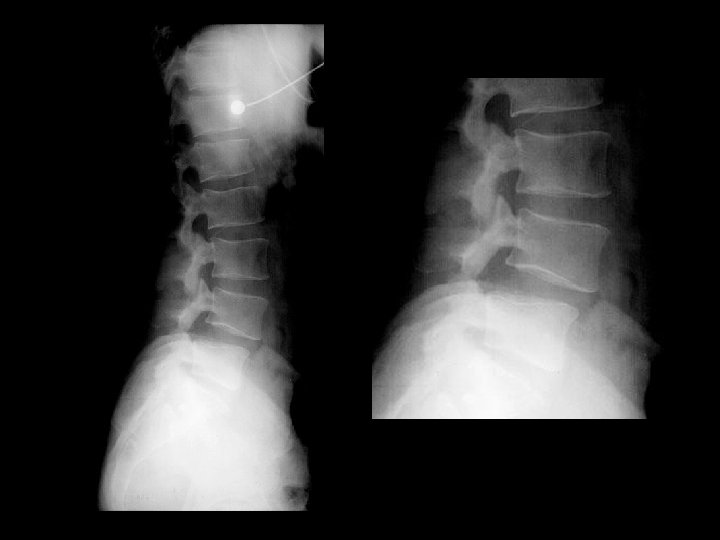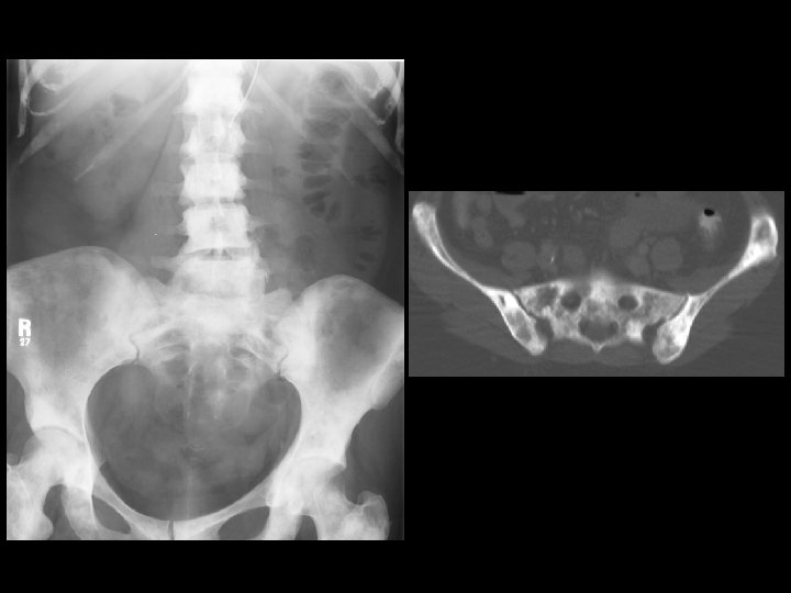 Ankylosing Spondylitis • Findings: – fused SI joints – right hip erosions – lumbar syndesmophytes • Sero-negative chronic inflammatory disease • Starts in the low back and progesses upward • ddx (sacroilitis) – bilateral • ank spond • IBD – unilateral • Reiter’s • psoriasis