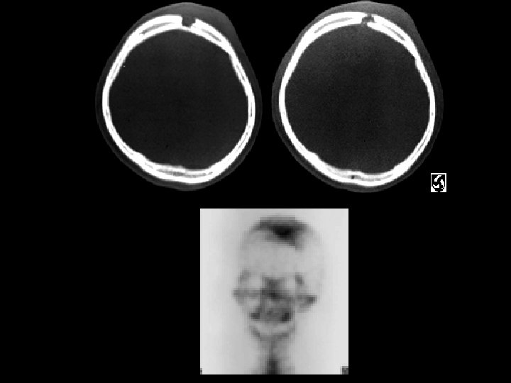 Eosinophilic Granuloma • Findings: – Well-defined lytic lesion in the frontal skull crossing the diploic space – Overlying scalp swelling – Positive bone scan • ddx: – Osteomyelitis – Metastasis