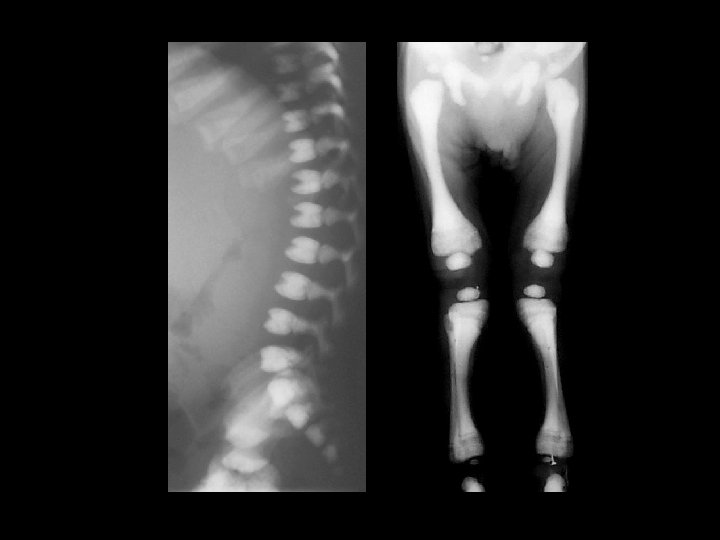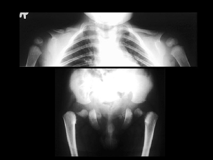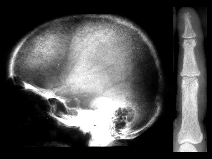 Osteopetrosis • Findings: – generalized increased bone density • rare bone dysplasia • Trabecular --> compact • Anemia w/extramedullary hematopoiesis • ddx: (children) – pyknodysostosis – renal osteodystrophy – vit A, D – Lead – Fluorosis