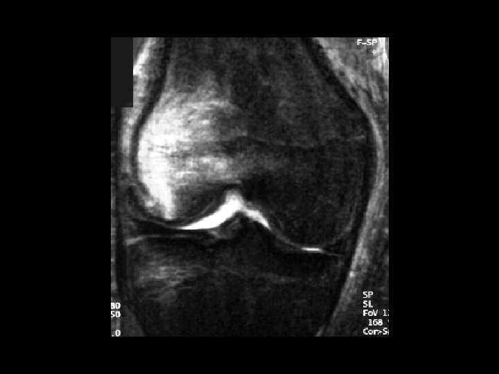 Bucket-Handle Tear • Findings: – “double PCL sign” - torn meniscus BELOW normal PCL on sag view – Above ACL on cor view – Truncation of medial meniscus – Joint effusion • Medial = 3 x lateral • Locked knee • ddx: – torn ACL, PCL – torn meniscus