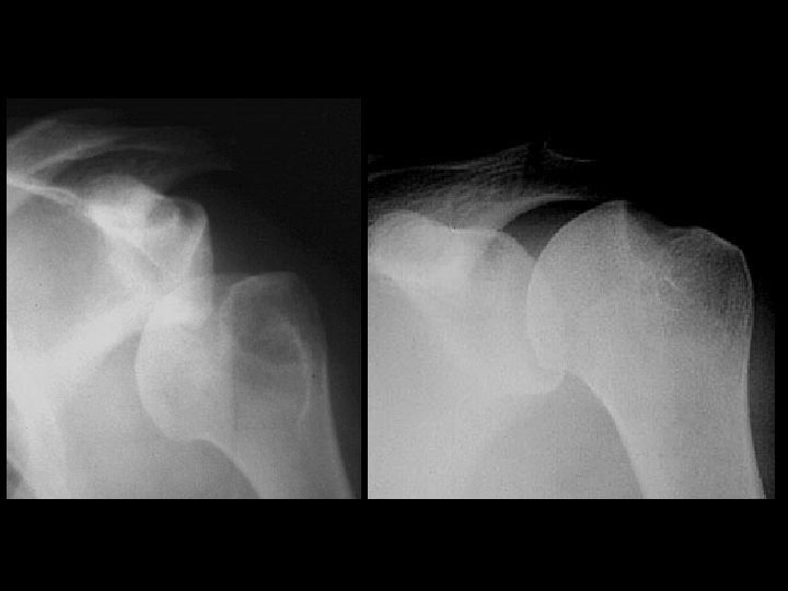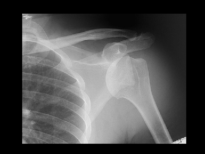 Inferior shoulder dislocation • Findings: – Inferior dislocation of humeral head and a deep cleft in the superior portion • ddx: – Anterior dislocation