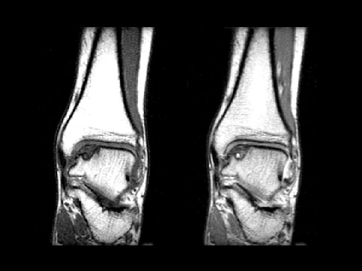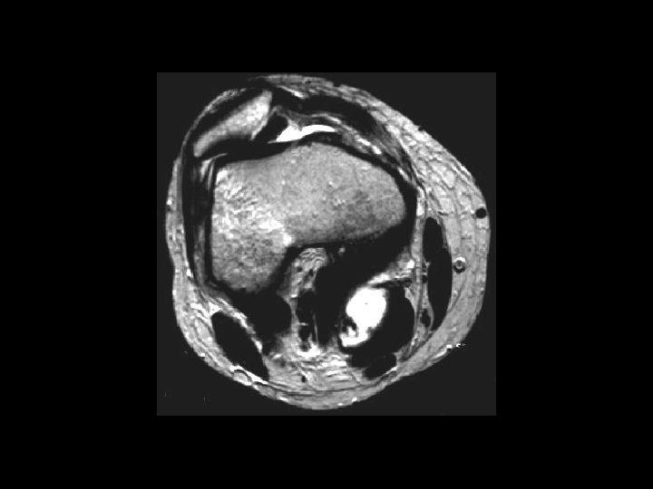 Lateral Patellar Dislocation • Findings: – bone marrow edema of lateral femoral condyle and medial patella – injury of the medial patellar retinaculum – joint effusion • Patella usually dislocates laterally • Look for constellation of findings • Ddx: – NONE! – This is an Aunt Minnie