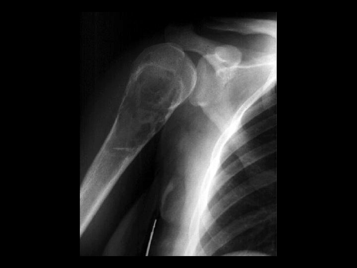 Unicameral Bone Cyst • • • Findings: – lytic, slightly expansile lesion of the proximal metaphysis with a thin sclerotic margin and fracture a. k. a. simple bone cyst fluid-filled cavity common lesion of children, unknown etiology asymptomatic unless fracture (“fallen fragment sign”)