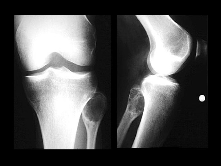 Giant cell tumor • Findings: – Expansile lucent lesion in the fibular head containing multiple thin septa • ddx: – Aneurysmal bone cyst – Fibrous dysplasia – Lytic metastasis – Brown tumor – Chondroblastoma (rare)