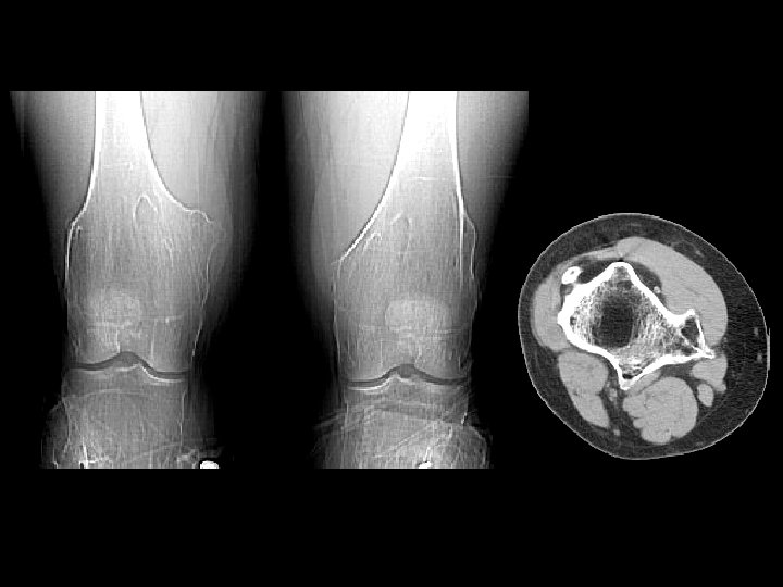 Enchondroma • Findings: – Patchy sclerotic intramedullay lesion in the proximal tibial metadiaphysis – “Rings and arcs” calcification • ddx: – Bone infarct