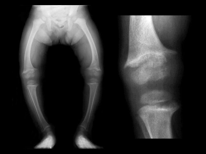 Rickets • Findings: – Cupped and frayed metaphyses – Wide physes (increased osteoid) – Long bone bowing – Decreased bone density • ddx: – NONE! – This is an Aunt Minnie!